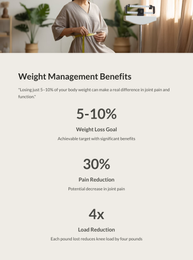 Losing weight is the second key factor. Even a 5–10% reduction in body weight can significantly ease joint pain and improve function. Balanced eating and a healthy lifestyle make a big difference in managing symptoms and staying active.