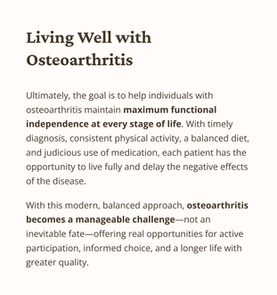 With this modern, balanced approach, osteoarthritis becomes a manageable challenge—not an inevitable fate—offering real opportunities for active participation, informed choice, and a longer life with greater quality.